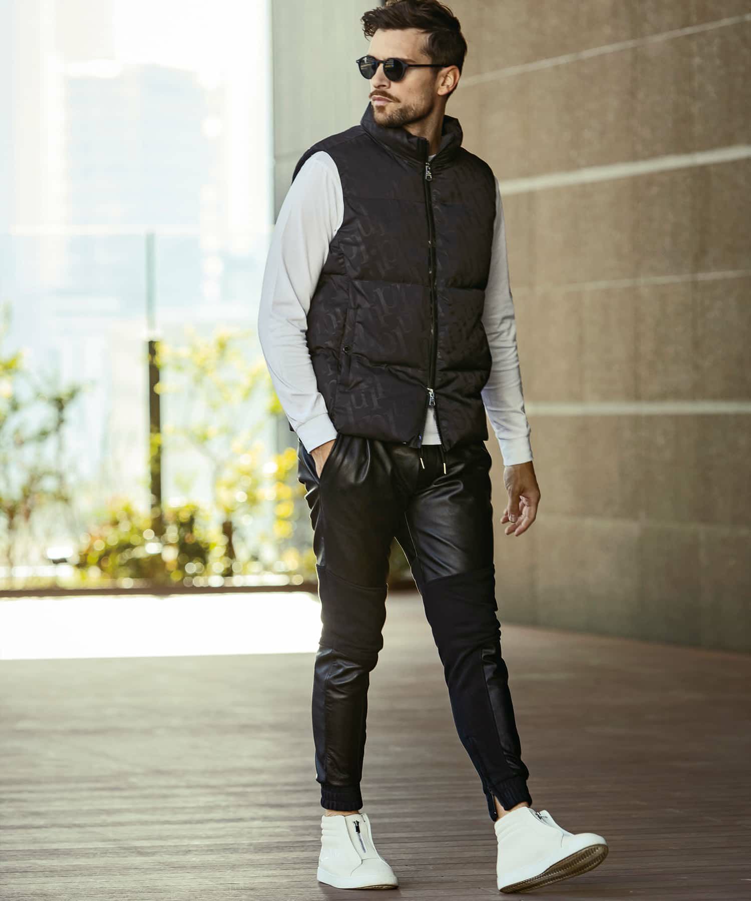 レザー×ヘビースウェットを大胆に切り替えたコンビパンツ。