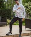 全体にブランドロゴをランダムに散らしたオリジナルの総柄がアクティブな印象を形成。