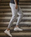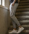 サイドにシルバープレートでブランドロゴを差し込んだロングパンツ。