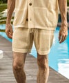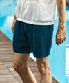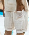 柄違いの透かし編みをブロックに配したハーフパンツ。