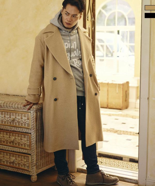 印象的なビッグカラーとオーバーサイズによりトレンドライクな着こなしが叶うダブルブレストのロングコート。
