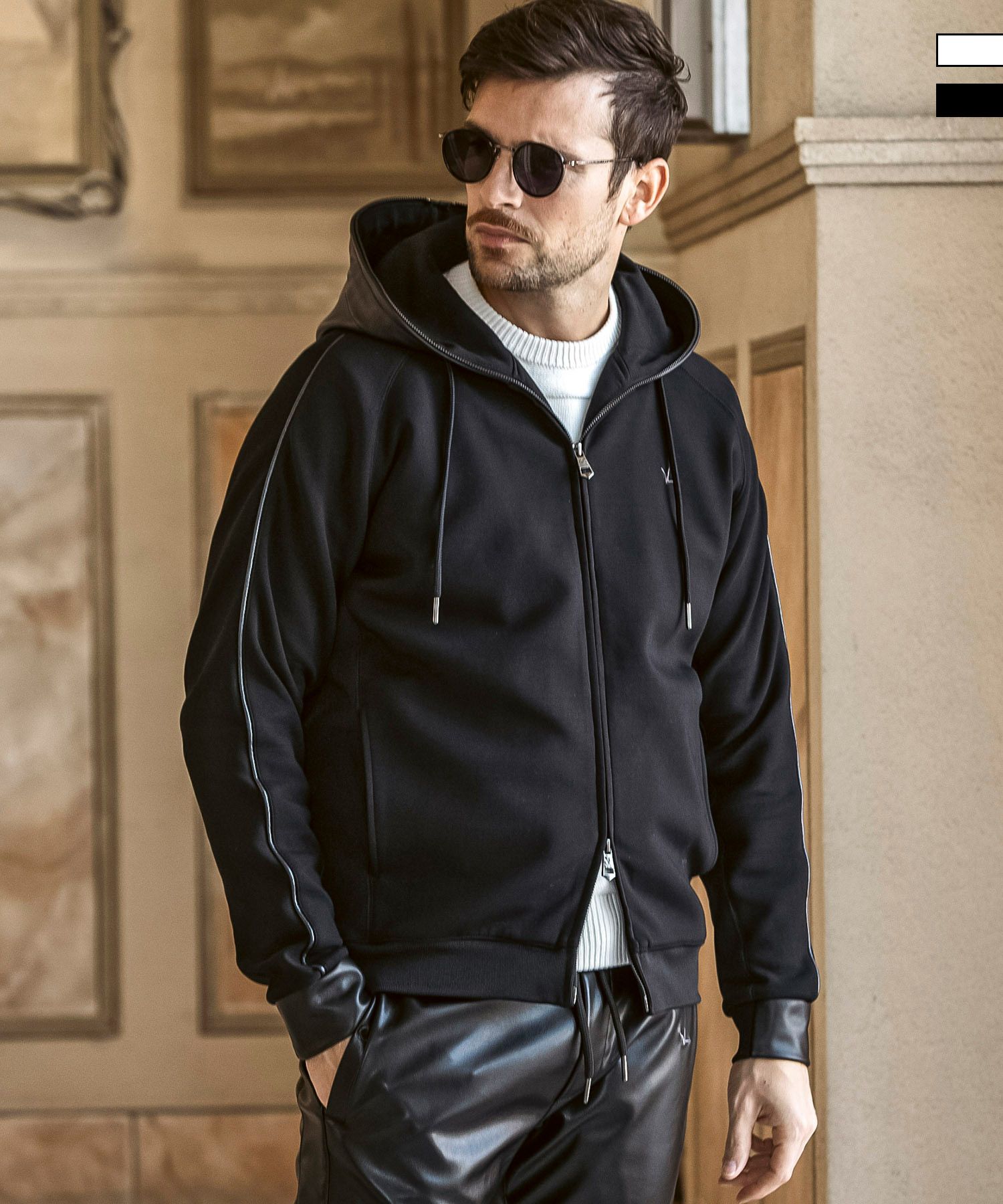 フードと袖にレザーを差し込んだ異素材ジップアップフーディー。