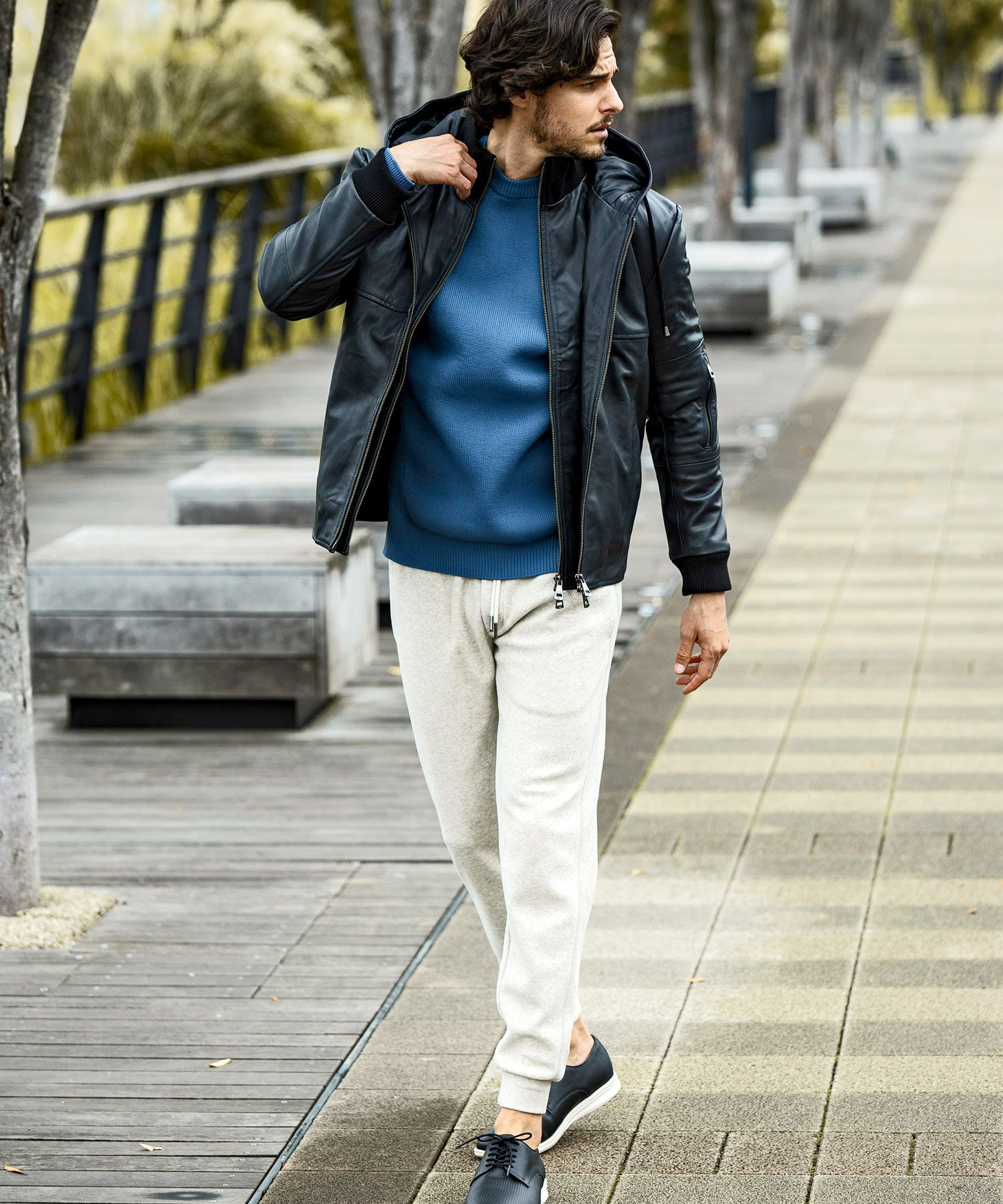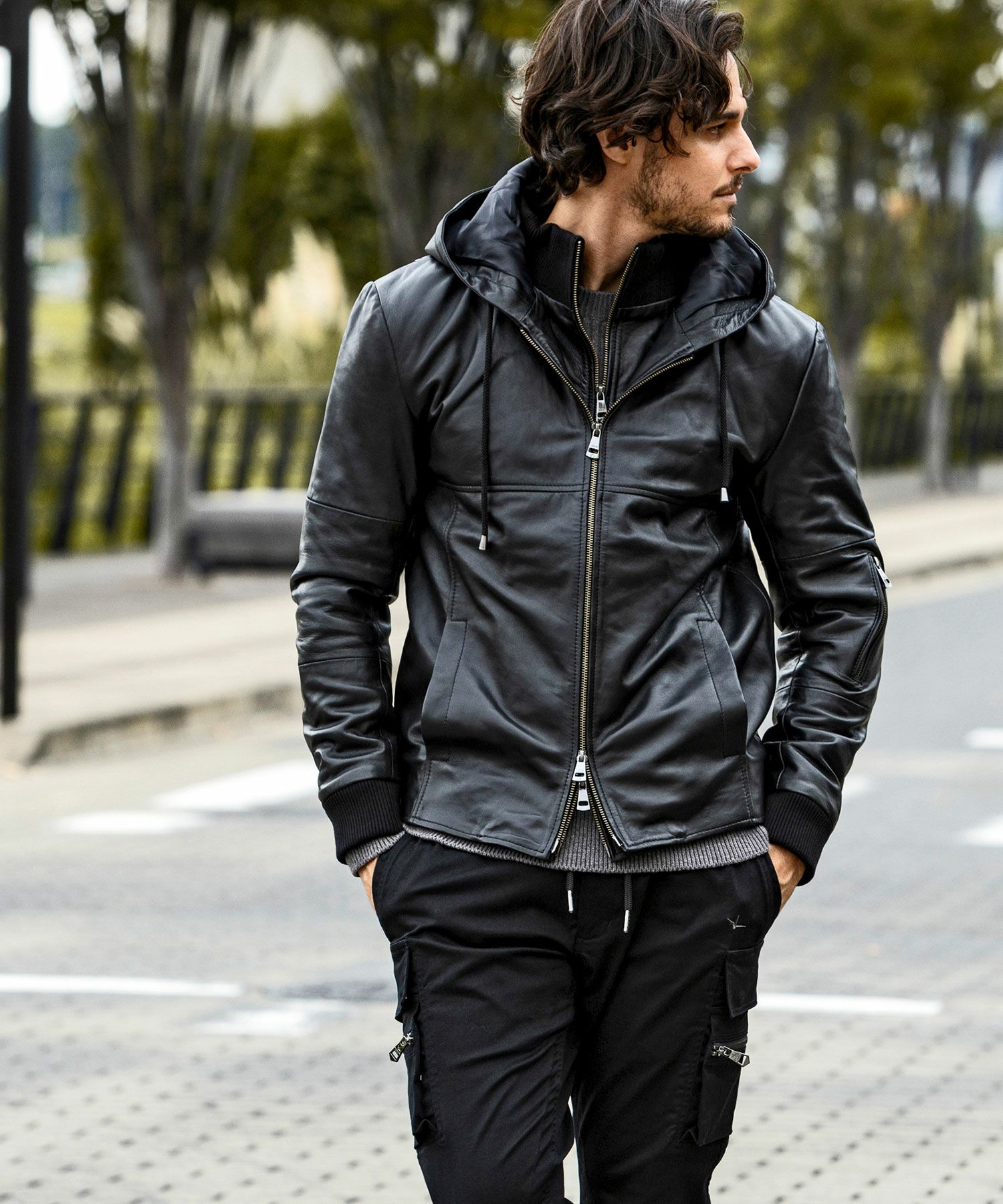 ハードなイメージの強い本革も、フードをプラスすることで程よくカジュアルダウン。
