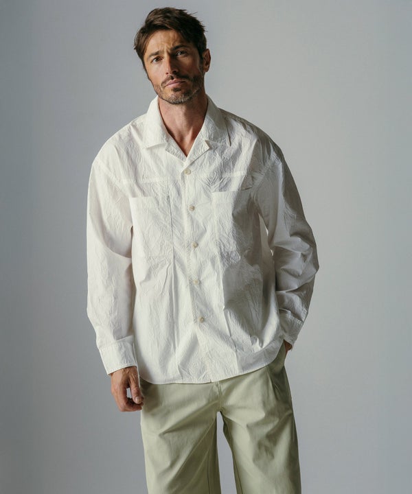 表面に独特のシワ加工が施された、軽やかな生地を使用した長袖シャツ。