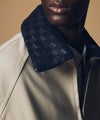 程よいハリ感の混紡素材を使用した本体と、光沢感のある柔らかな羊革(シープスキン)を使用した編み革襟の異素材コンビネーションが上品で洗練された印象を演出。