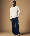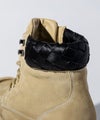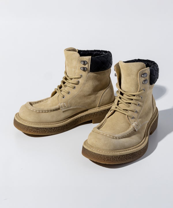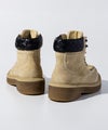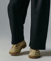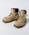 履き口の素材感とスタイリッシュなシルエットが、カジュアルからワークテイストまで幅広いコーディネートにマッチ。足元にさりげないアクセントを加える一足です。