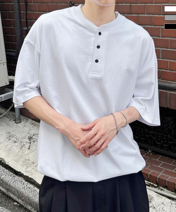 シンプルなヘンリーネックTシャツが登場。ゆったりとした着心地のルーズシルエットが魅力。