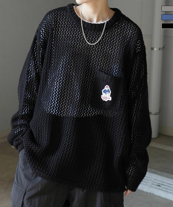 ILL'S(イルズ)【RED CAP GIRL】 ビッグシルエット ワンポイント刺繍 メッシュニットプルオーバー