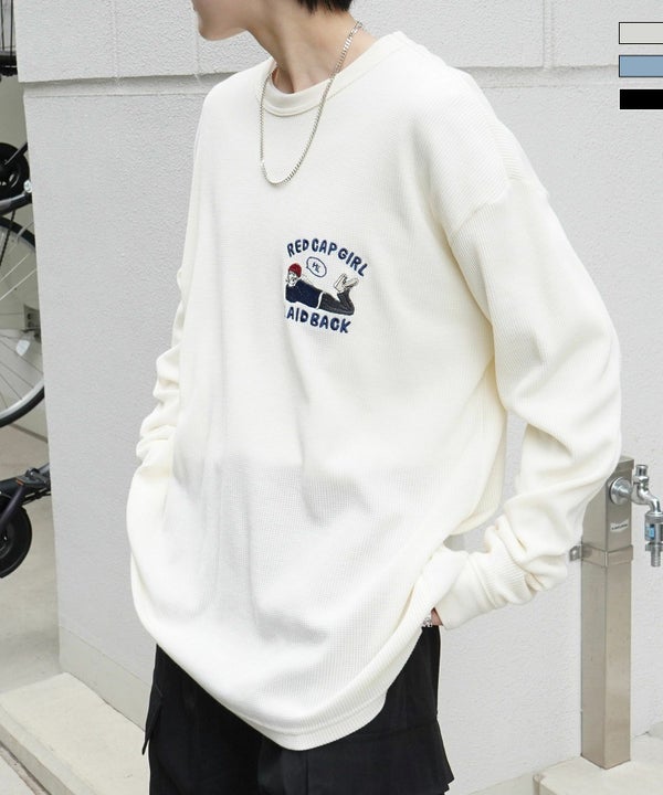 ILL'S(イルズ)【RED CAP GIRL】 アウトステッチ / ワンポイント胸刺繍 ビッグシルエットワッフルロンT