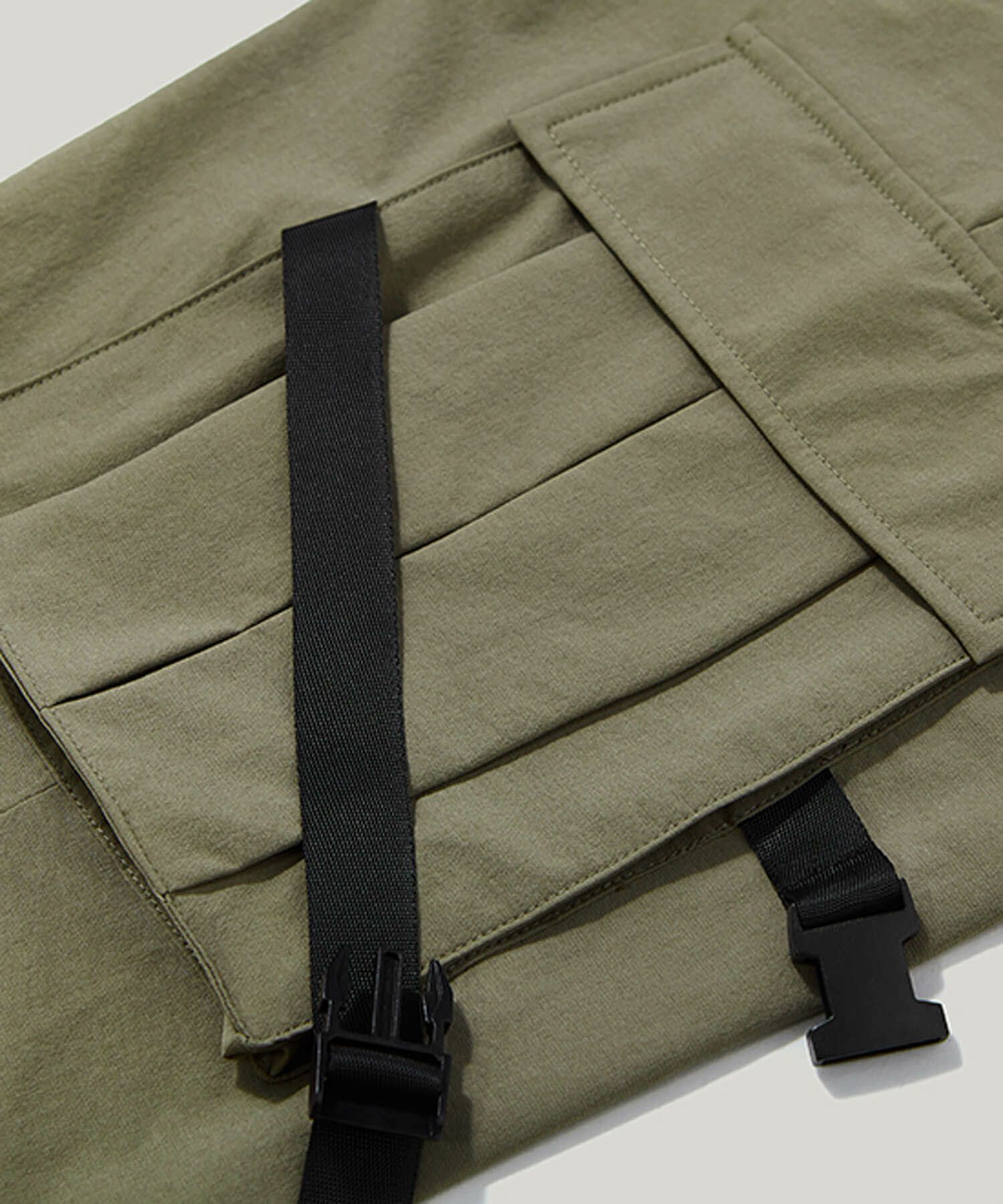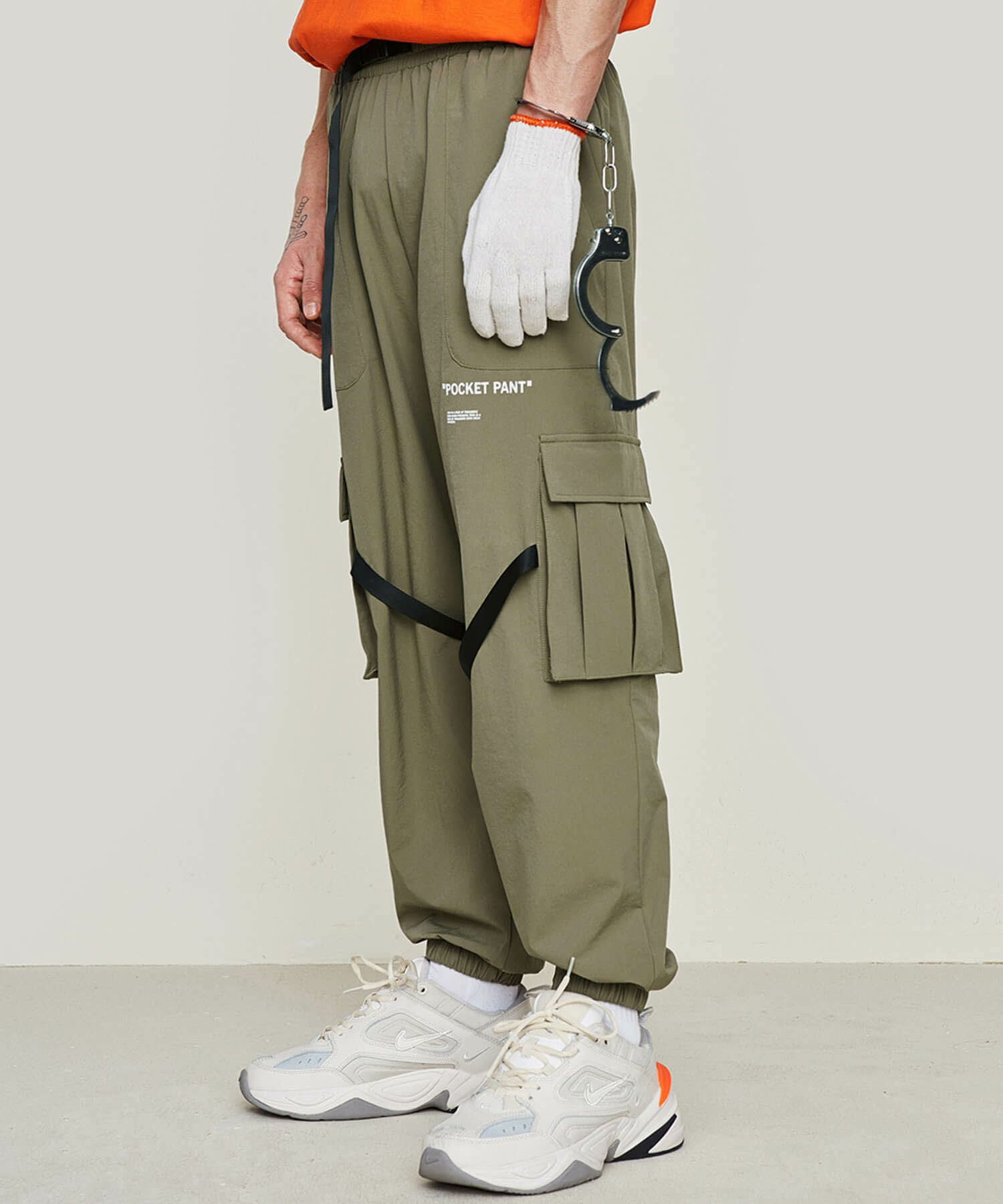 膝周りのバックルベルトがパンキッシュな雰囲気ながらも、ゆったりめのシルエットと適宜施されたタイポグラフィがストリート調の雰囲気に仕上げています。