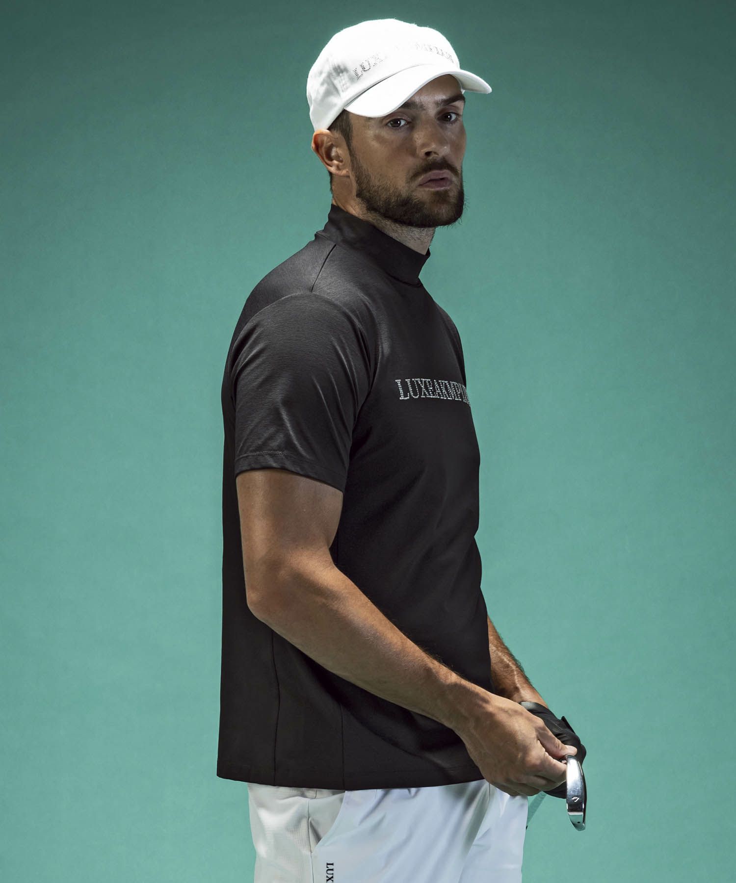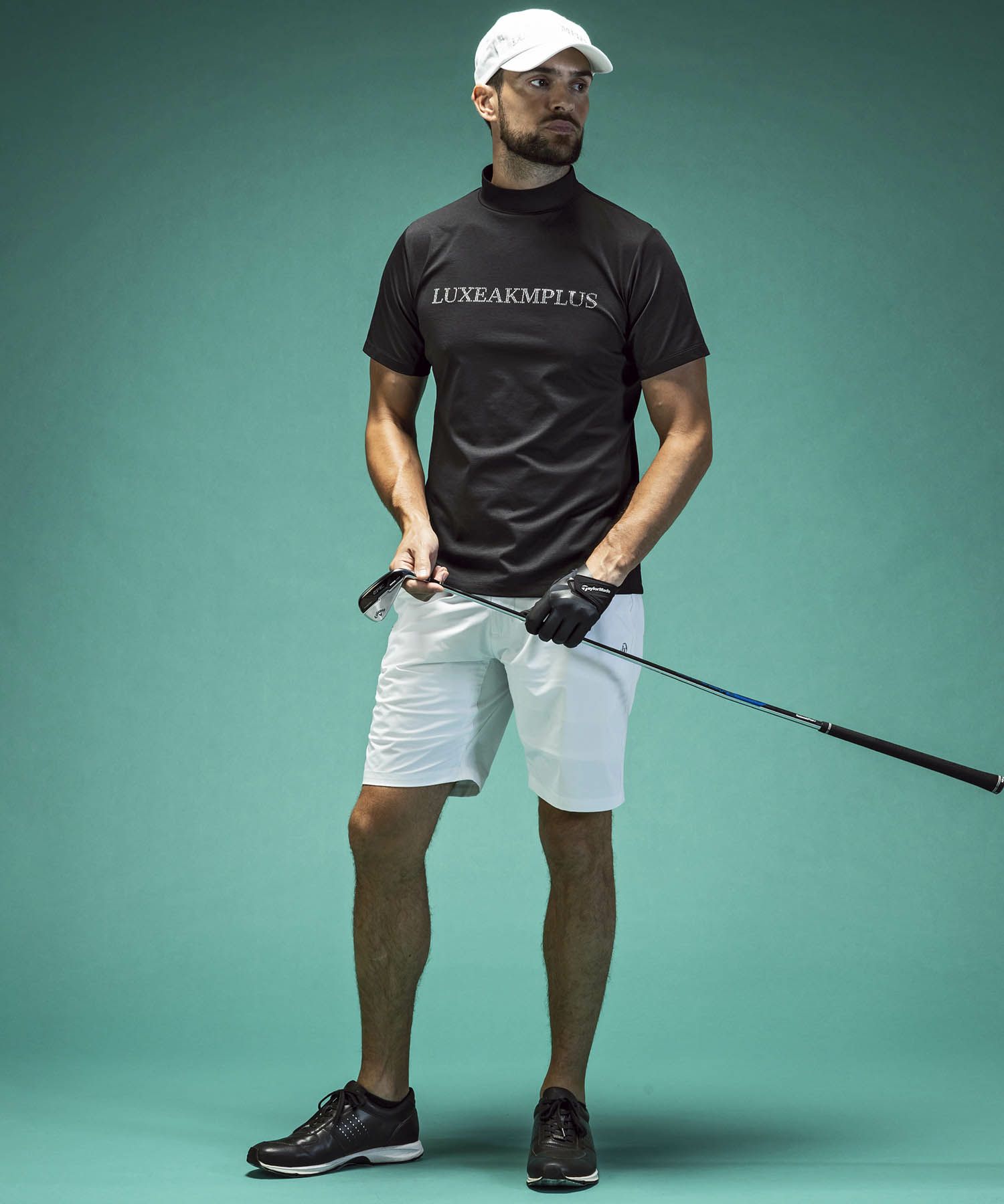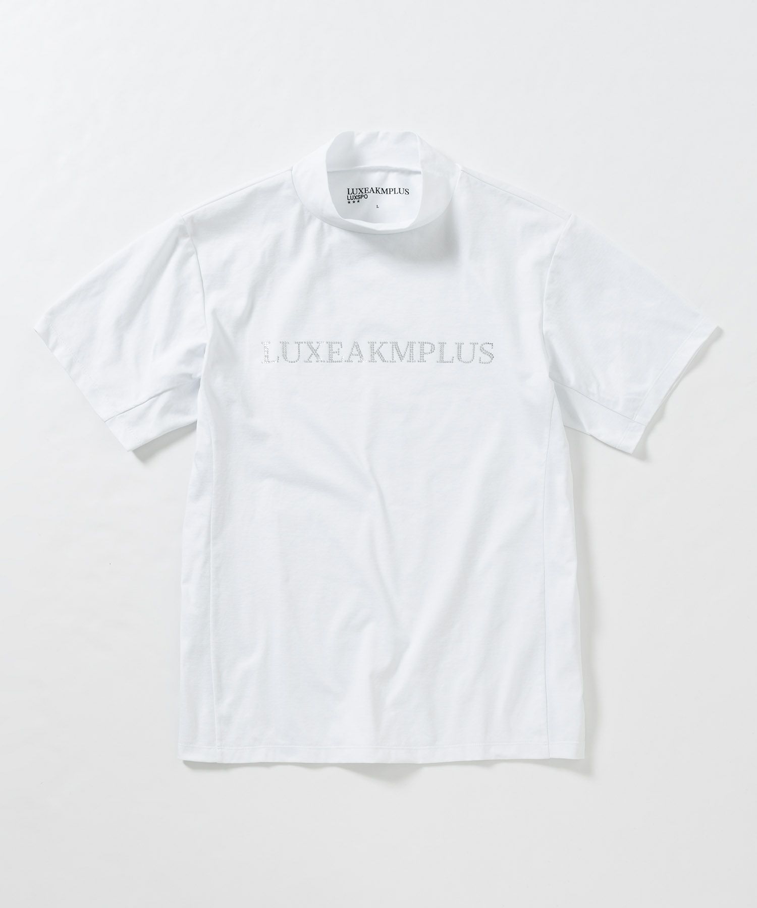 LUXEAKMPLUS(リュクスエイケイエムプラス)ゴルフ ラインストーンロゴ半袖モックネックTシャツ