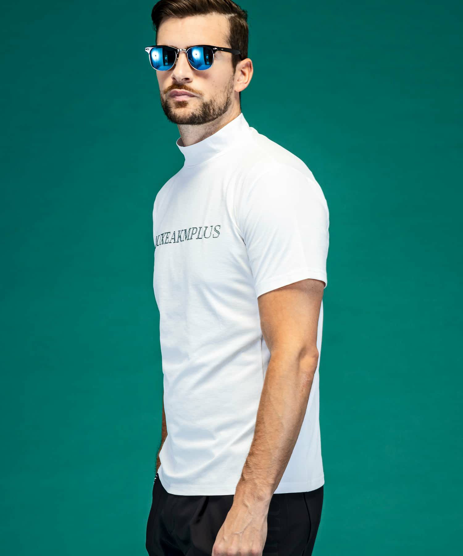 フロントのラインストーンロゴがラグジュアリーな半袖モックネックTシャツ。