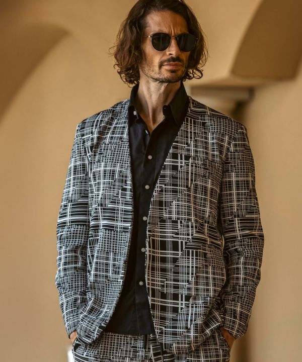 幾何学柄をジャガードで表現したニュアンス豊かなノーカラージャケット。