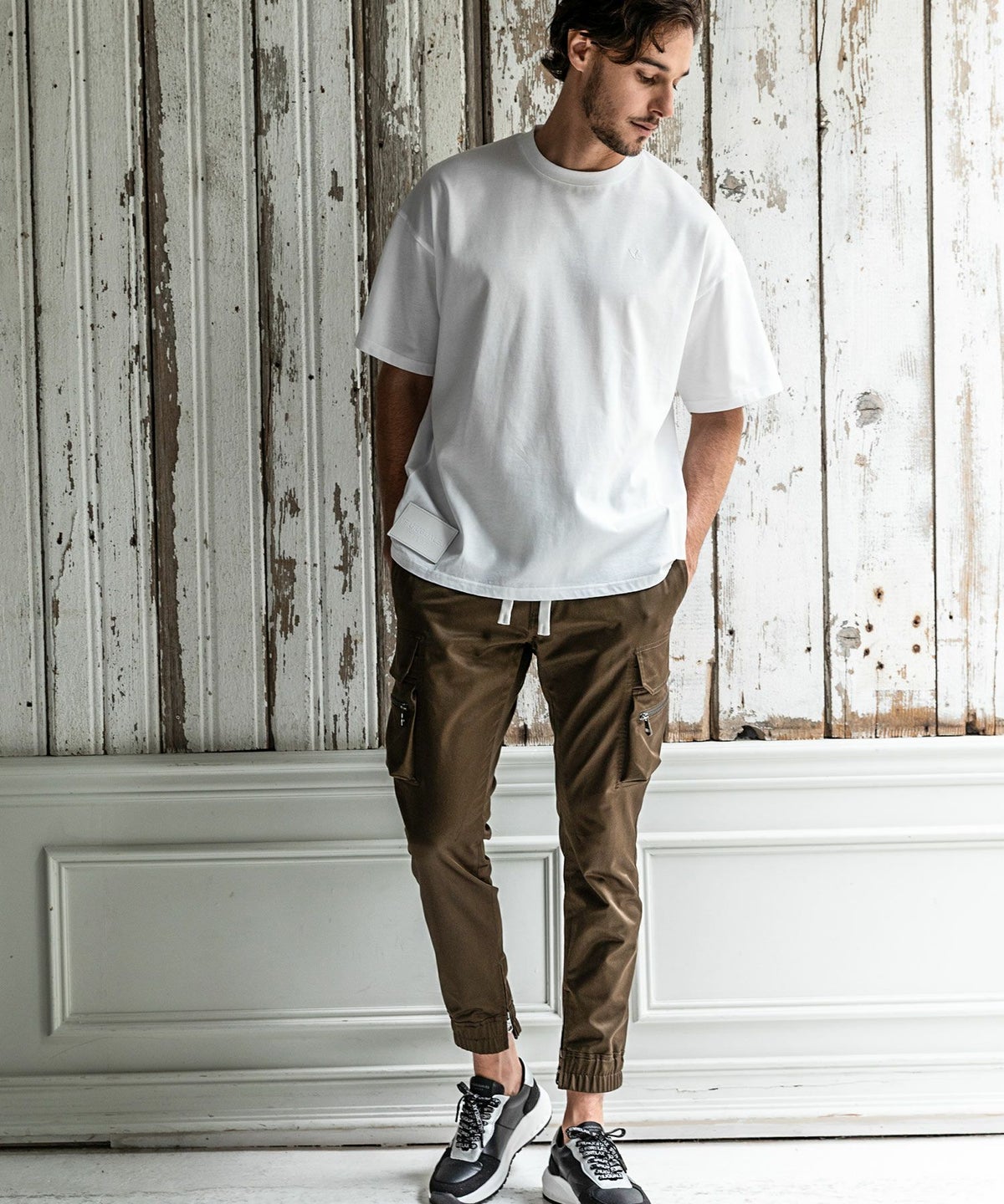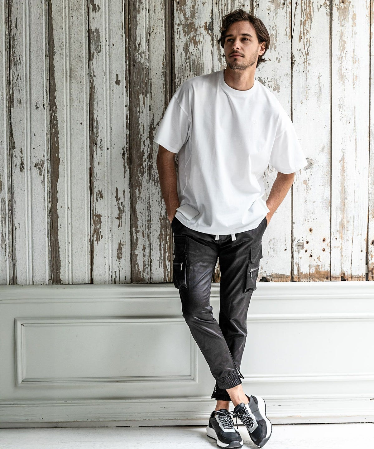 1PIU1UGUALE3 RELAX(ウノピゥウノウグァーレトレ リラックス)レザーコンビネーションスリムカーゴパンツ