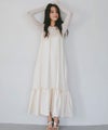 胸元にさりげなく寄せたギャザーと、裾のフリルディテールで程よく甘さをプラス。