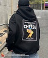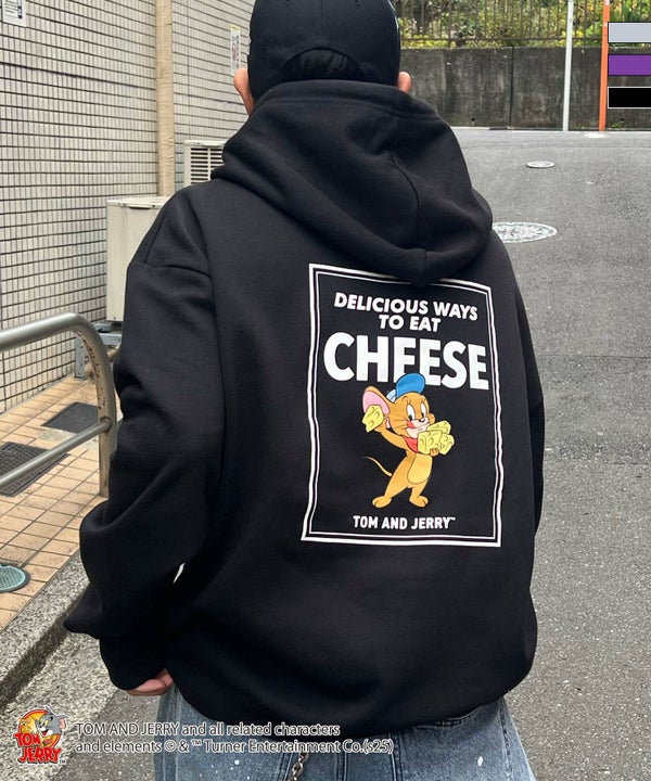 背中には、チーズを抱えるジェリーと「DELICIOUS WAYS TO EAT CHEESE(チーズのおいしい食べ方)」というユニークなレタリングを大胆にプリント。