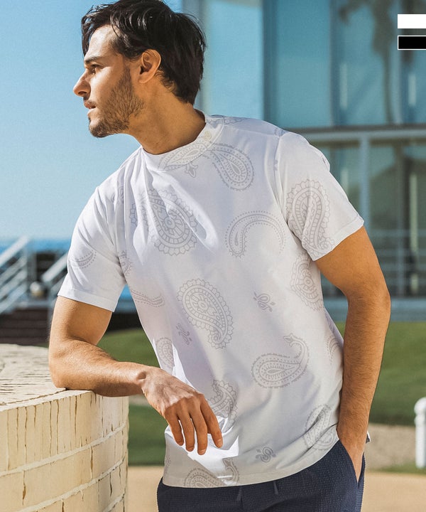 オリジナルのペイズリー柄がリゾートライクなモックネックTシャツ。