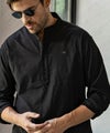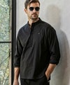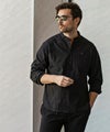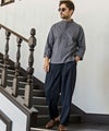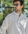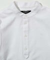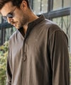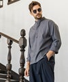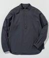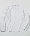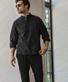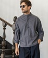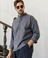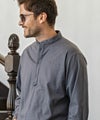 端正なバンドカラーに、胸元へと伸びるヘンリーネックが抜け感を添えた一着。