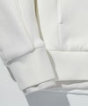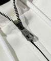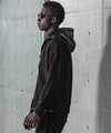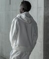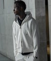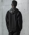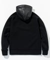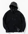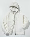 フード、袖・裾口にレザーを差し込んだジップフーディー。
