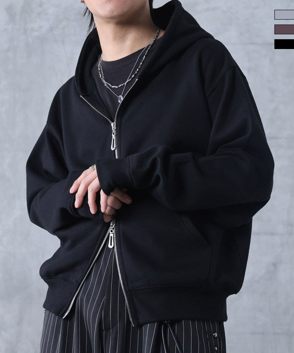 ルーズなシルエットをサムホールで引き締め、スタイルアップも着こなしも自由自在。モードストリートな万能ダブルジップパーカー。