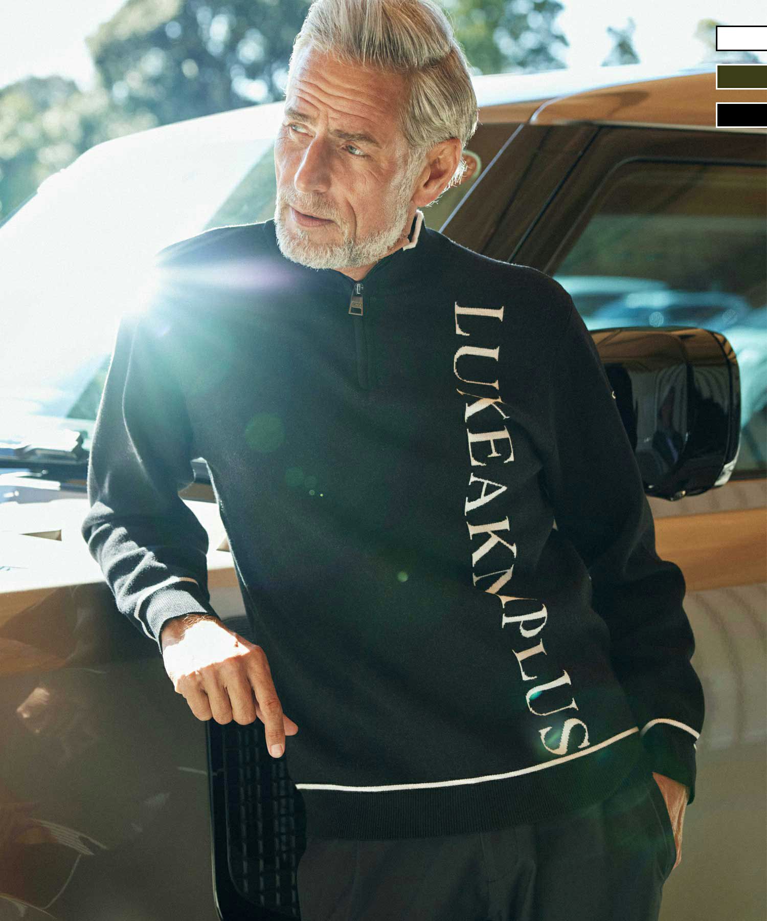LUXEオリジナルのロゴを縦に大胆にあしらったハーフジップニット。