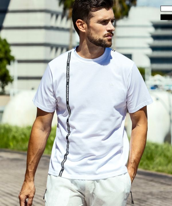 ブランドロゴを縦に走らせた半袖Tシャツ。