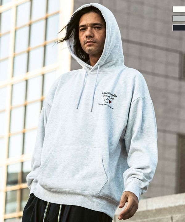 背面に大胆にプリントされた可愛らしいロゴが目を惹くパーカー。