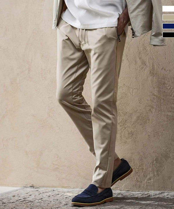 ストレッチ性に優れたナイロン素材で仕立てたスラックスパンツ。