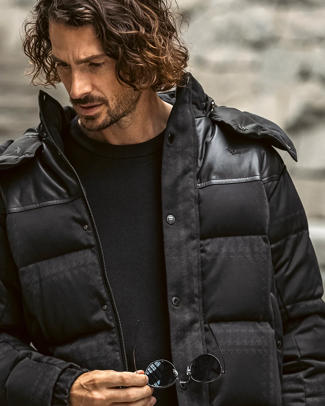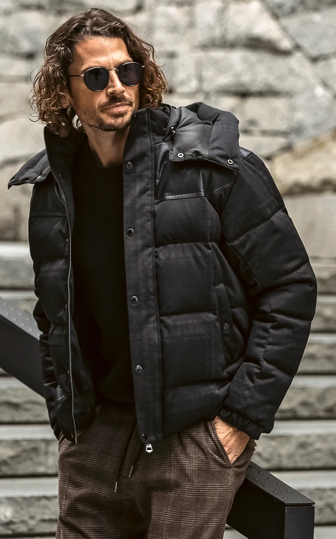 千鳥柄でウィンドウペンを描いた印象的なジャガードダウン。