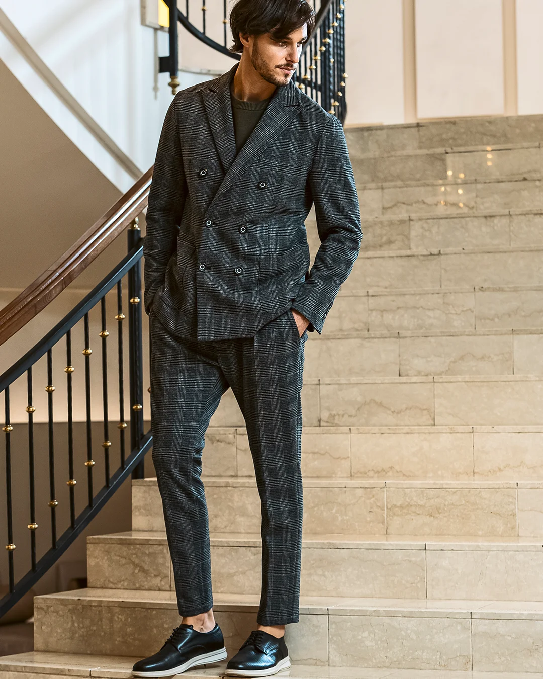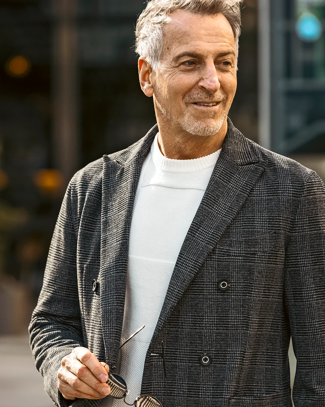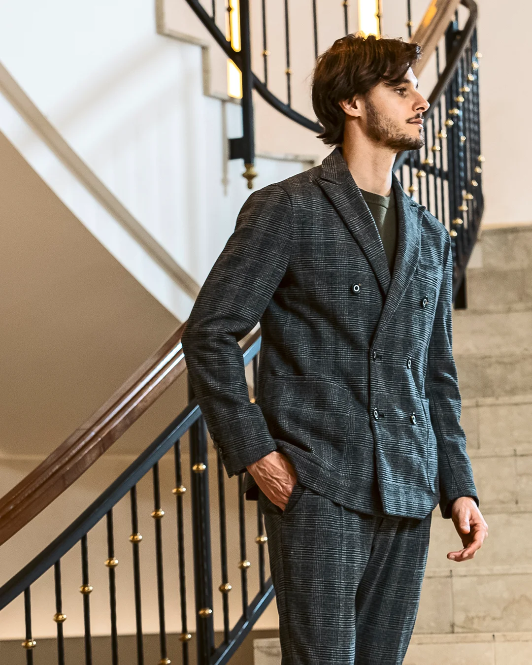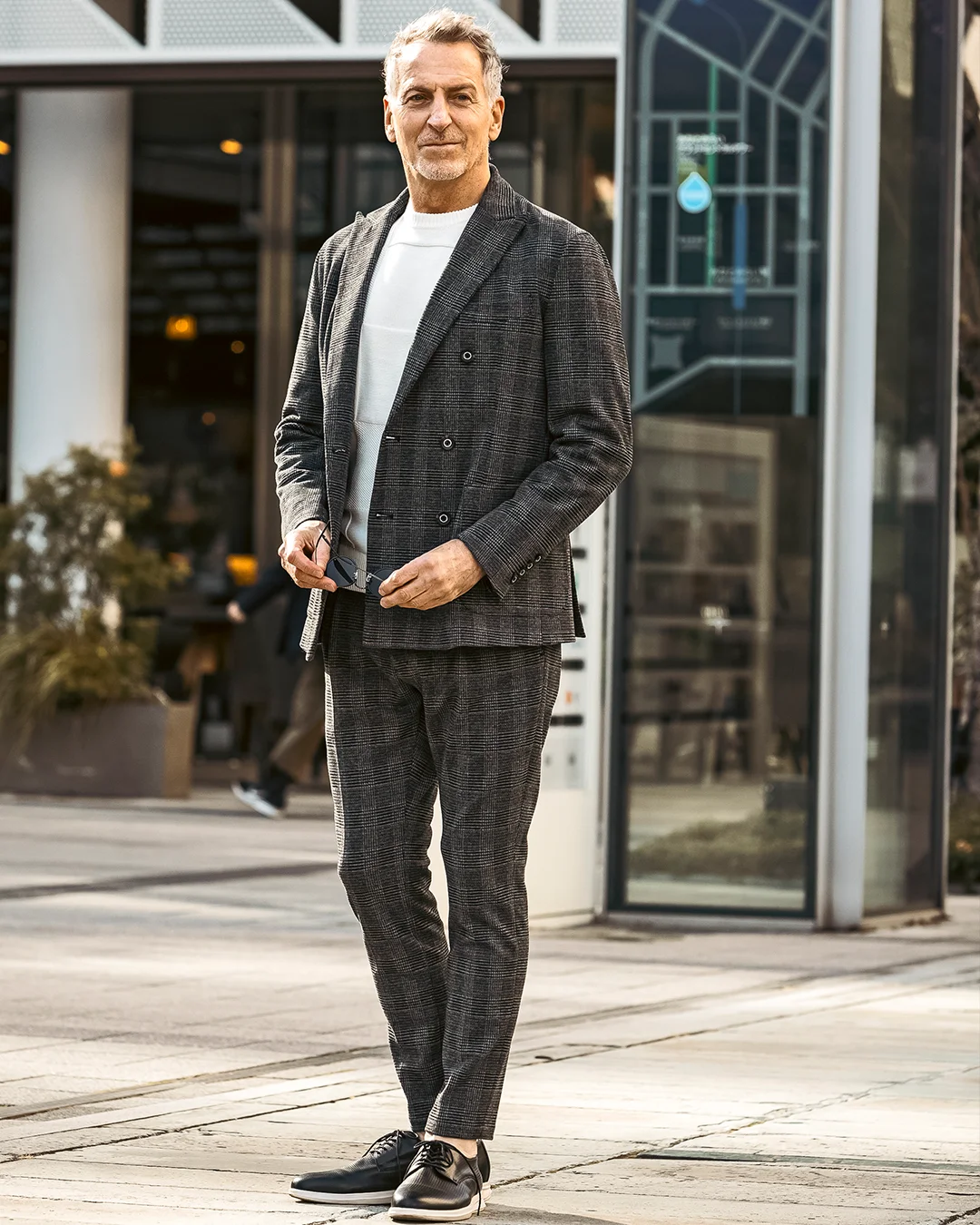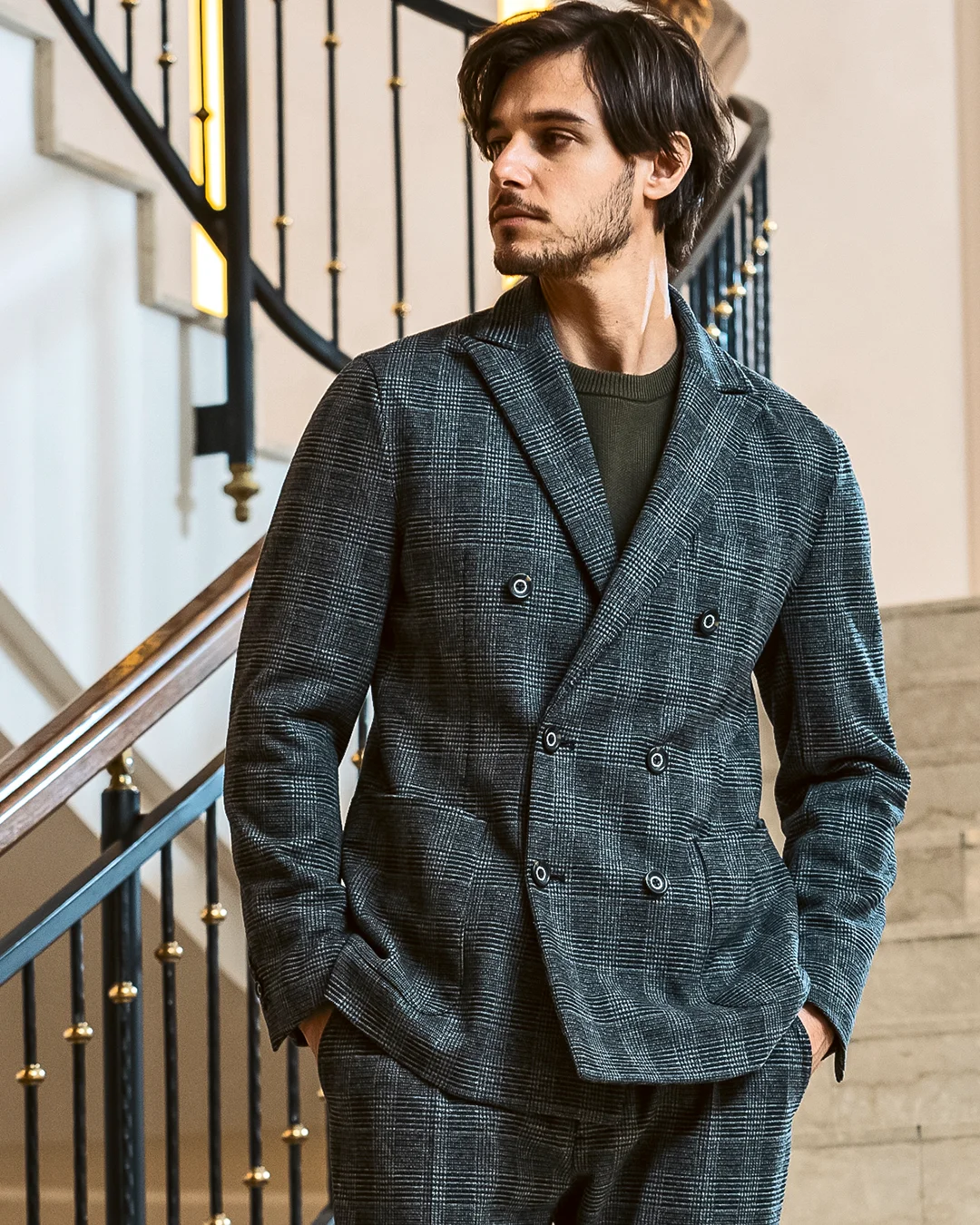クラシカルなグレンチェック柄が落ち着いた品格を演出するダブルジャケット。